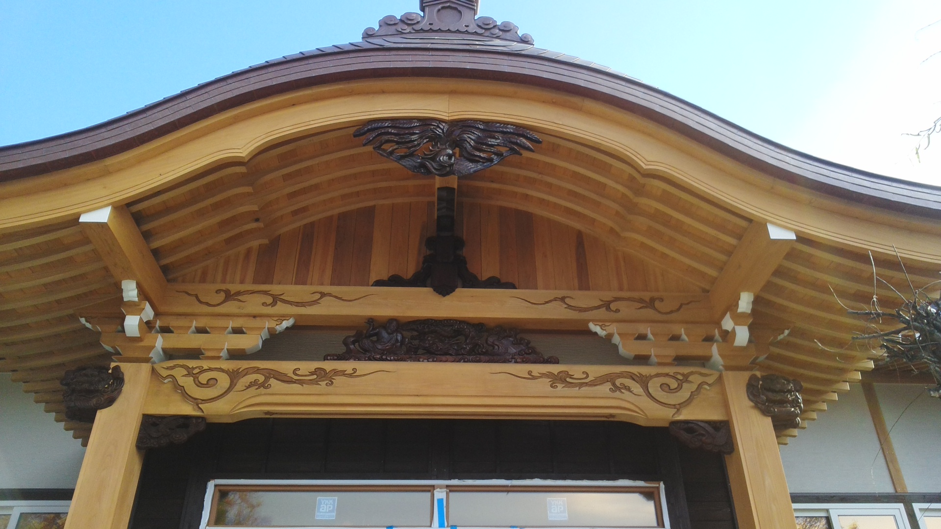 先月の12日に来て以来ですが足場解体しての確認は、写真で無くやはり自分の目で見なくてはと楽しみにして来ましたが、この鯵が沢の田舎町の風情に合ったデザインと意匠に大変満足しました。造り手の私達が納得した建物をお渡ししてこそ本物の宮大工専門職としての使命と心に誓いこれからも精進します。 そして住職にお会いしてその満足感と喜びを感じながらここまでくるまでにいろんな難題を解決し、また、これからも様々な問題を解決し寺院の形を造り上げて行くのだなと感じました。 私達は,可能な限り協力出来れば幸いと思って折ります。しかし,鯵が沢は,穏やかな気候で今日も大変暖かったです。後、2か月程ですが、塚本さん、釜石、畑山の三名は,頑張って欲しいです。