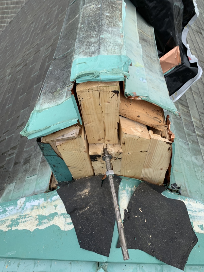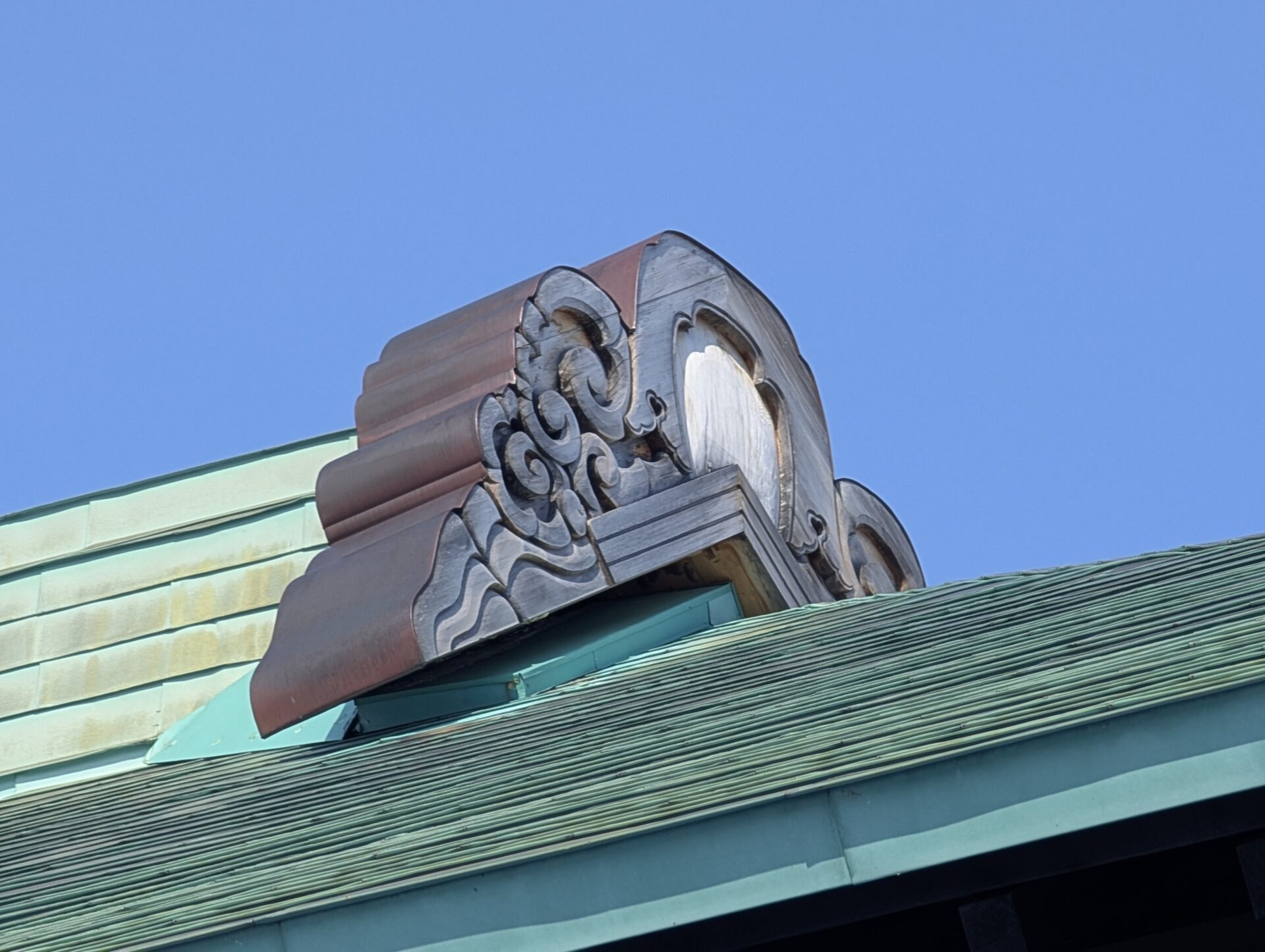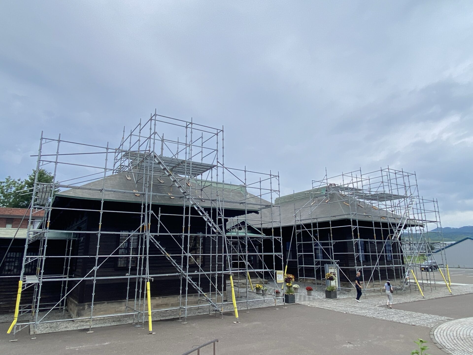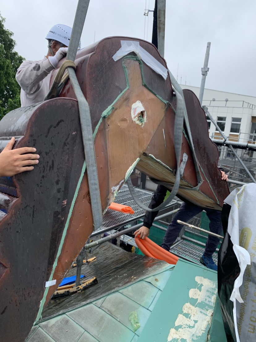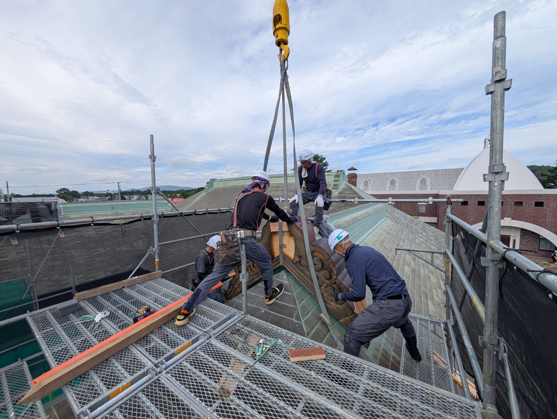 月形町にある樺戸博物館本館の前にある、旧樺戸修治監本庁舎において鬼板が積雪によって落下しそうだったものを再固定して復旧の作業をしています。