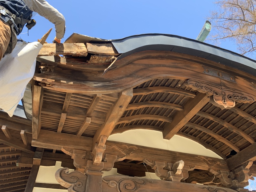 向拝の屋根部分が雨漏れによる木材の腐食で一部折れてしまった為、向拝部の屋根を修繕します。